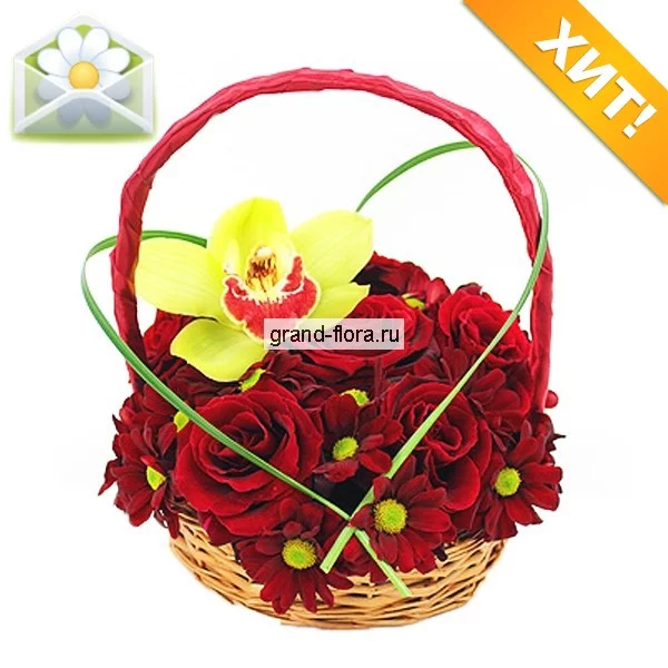 Корзина цветов «Возьми мое сердце» составлена из алых роз и хризантем, этот цвет свидетельствует о страстной и жгучей любви. Сердце, сделанное из декоративной зелени и украшенное орхидеей, показывает, что ваша любовь не только страстна, но и нежна. Этот букет может стать как признанием в любви, так и пожеланием встретить самую яркую, страстную и великолепную любовь на своем пути.