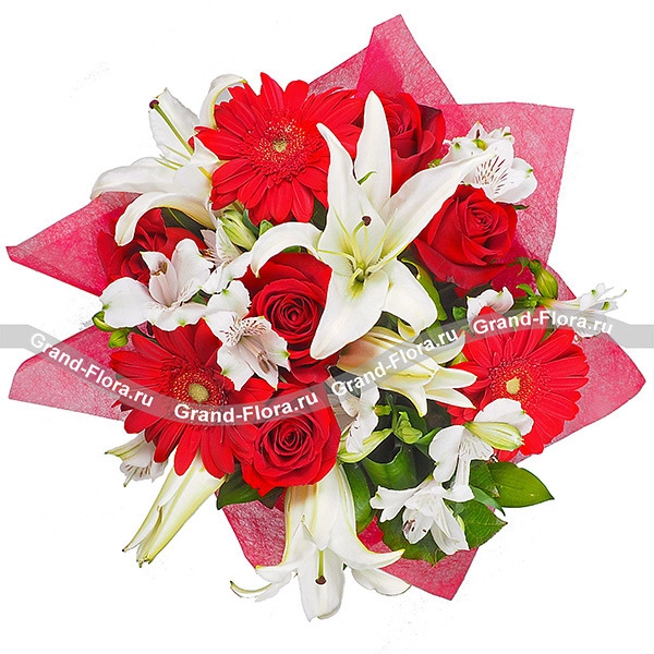 Восхищались ли вы когда-нибудь грациозностью, нежностью и трогательностью лебедей? Именно такие смешанные чувства вызывает этот чудесный букет. Дизайнеры-флористы добавили к красной гербере розу в тон и разбавили белыми лилиями — получилась сказочная красота.