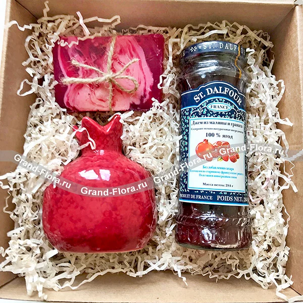 Интересная коробочка с подарками внутри! Оригинальная ваза в форме граната, брусок мыла ручной работы с ароматным маслом и приятной текстурой, очень вкусное и полезное варенье из калины и медом – суфле, изысканным и популярным десертом. Композиция станет хорошим подарком для Ваших близких, порадует и подарит массу положительных эмоций, а так же Вы можете дополнить ею букет цветов.